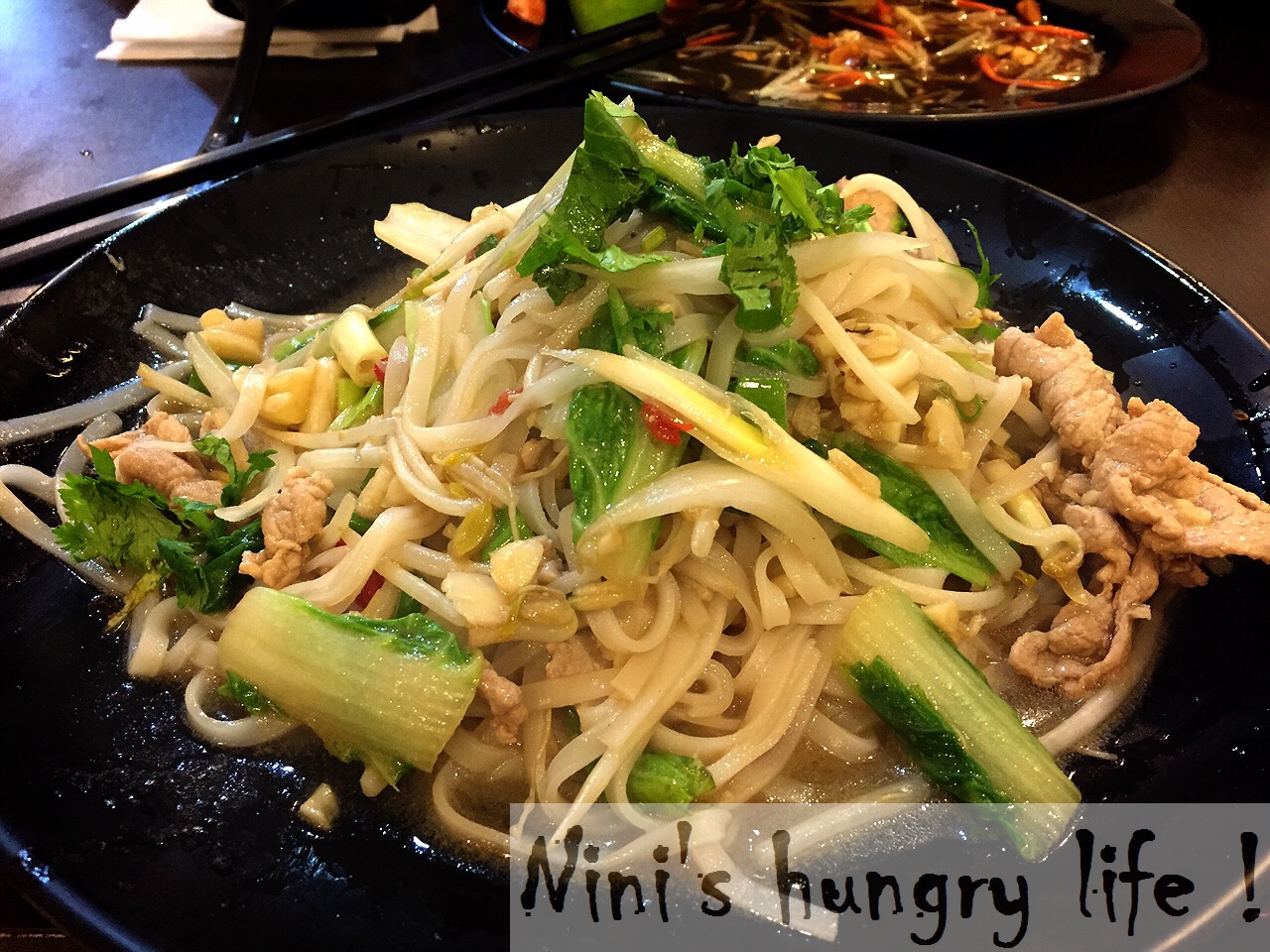 店內明亮乾淨,沒有多餘的布置,但牆面上有很多越南風情的海報。我點了炒豬肉河粉,歐巴點了烤豬肉乾拌米線跟一份涼拌青木瓜。