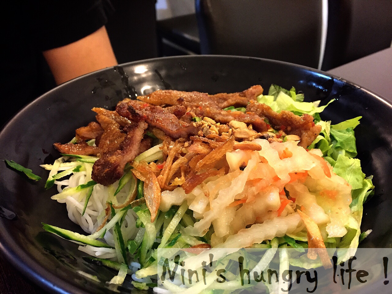 歐巴點的烤豬肉乾拌米線,是薄薄的豬里肌,經過火烤然後沾上越式的醬汁,口味清爽沒有負擔。很適合夏天太熱的時候開胃。
