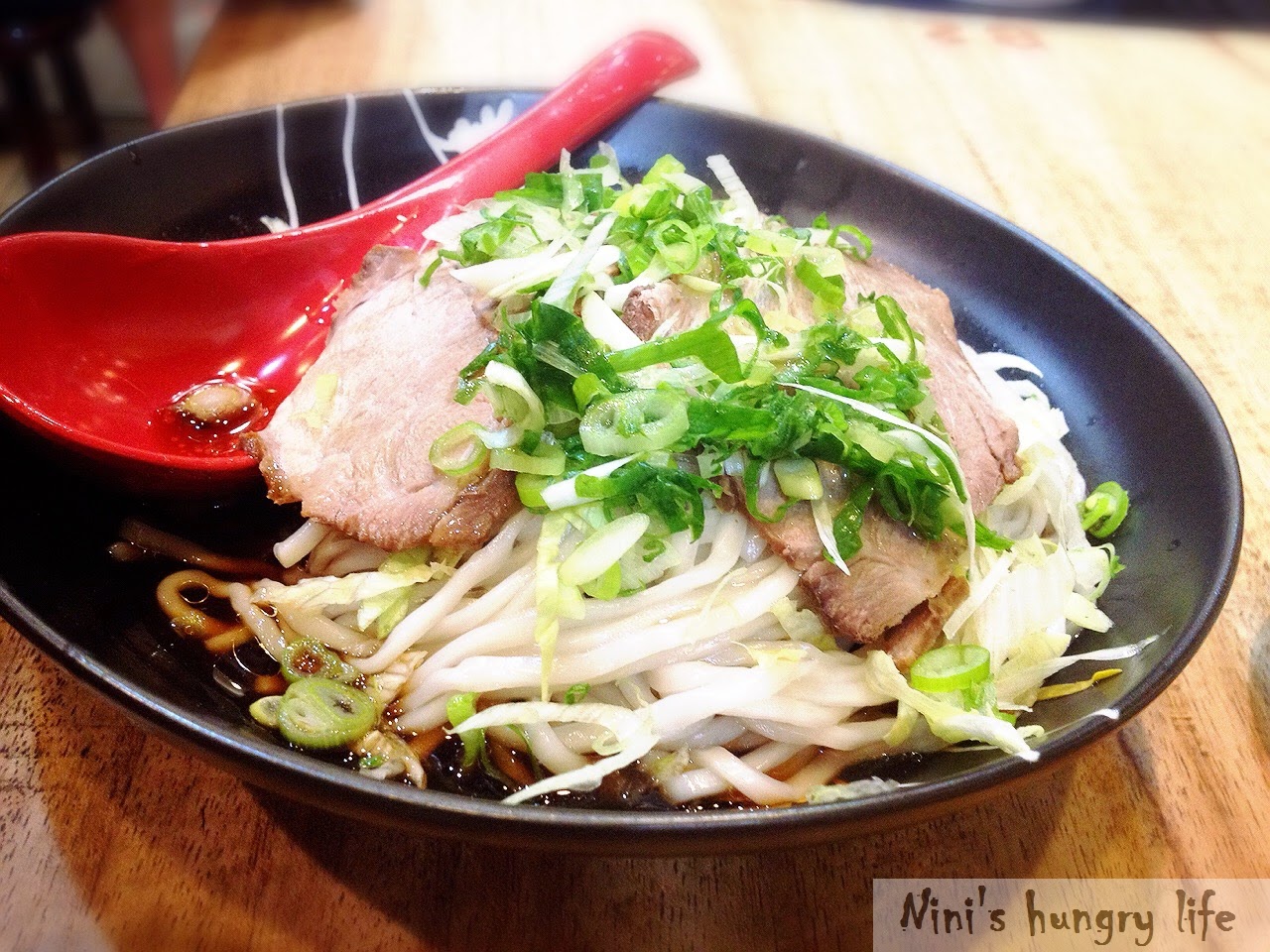 我跟歐巴去吃的時候(欸...有讀者跟我說每次看食記都在看我歐巴長歐巴短,其實前面我有特意不提到啊,但就有點不知道怎麼寫下去:P)。平常我們都是點乾拌麵,搭上他的涼拌白菜絲,Q圓彈牙的白麵條,有嚼勁卻不會太硬,粗細剛好(比一風堂粗辛拉麵細),歐巴每次都點招牌豬肉乾拌麵,我則是看看當天的天氣(比較涼的時候會點蔬菜或是豚骨湯)