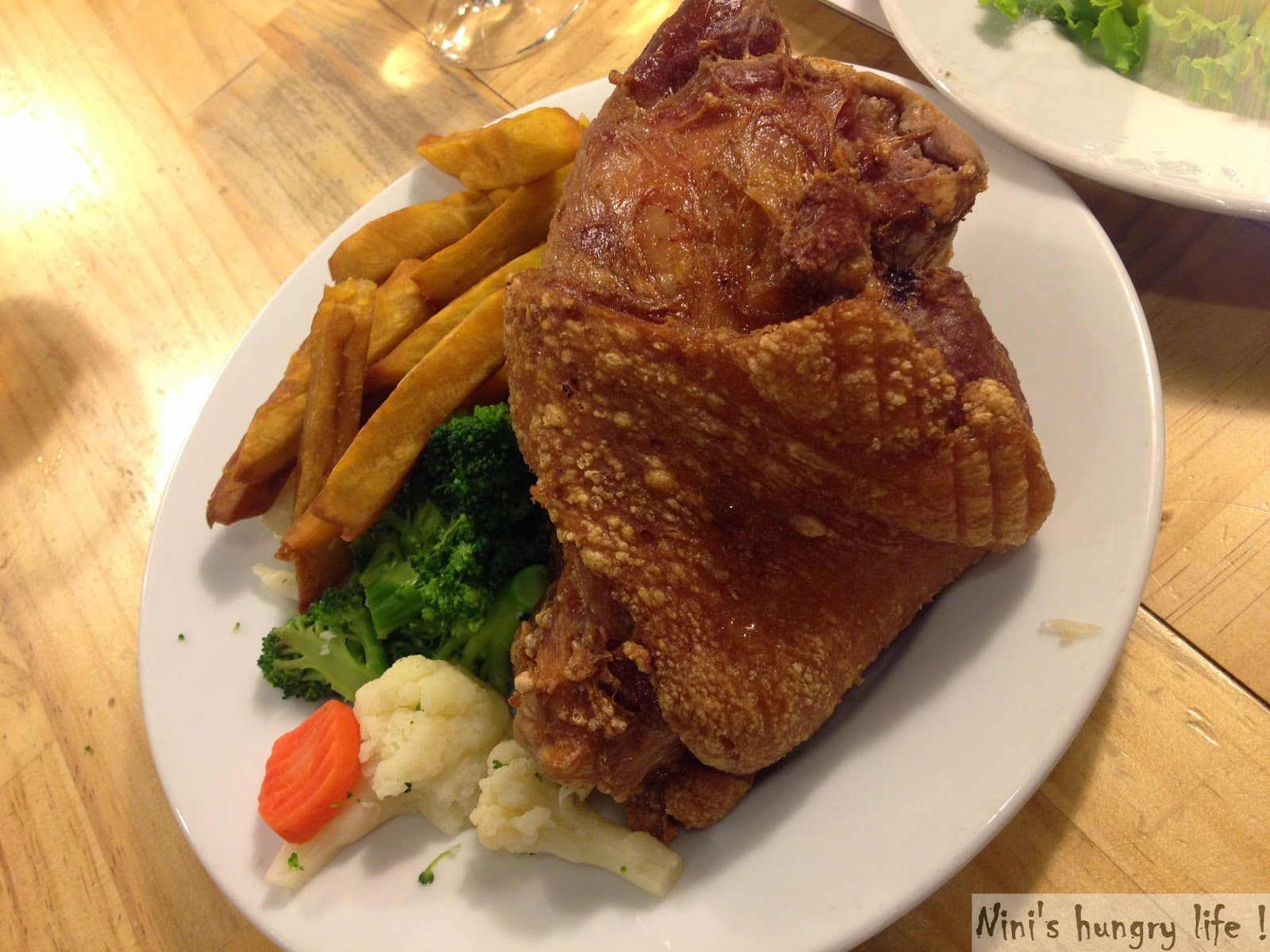 一直都超愛德國豬腳!!!但是對於這個價位,實在沒有帶大的信心(IKEA甚至比好市多的冷凍豬腳便宜啊!!!)在點餐時,會感覺服務生非常大器,整把的地瓜薯條不斟酌秤重,整把的花椰菜也是毫不手軟,酸菜也是裝滿整個盤面,最後放上表皮酥脆的大豬腳。本來一直覺得很餓不夠吃,但是看到這豬腳就有滿滿的飽足感。應該因為是速食店的關係,豬腳皮看起來著色的很均勻,可是其實烤的不夠透,味道夠,但酥脆不夠,用起沒有殺傷力的刀具,超級難分割的啊。但是腱肉的部分,纖維夠軟,雖然帶筋卻不會過韌,醃製過的豬肉配上黃芥末和酸菜,很下胃。本來覺得我們是兩架餓昏了的殭屍,但卻連一支豬腳都吃不完啊,還剩下三分之一打包回家。