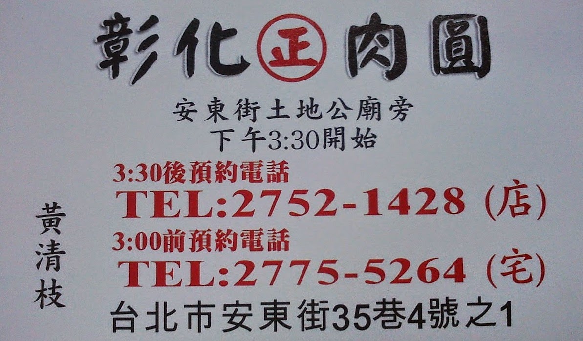 附上安東街彰化肉圓的名片,想吃的話記得一定要先打電話跟老闆預約。位置是在忠孝復興站一號安東街出口,右邊第一條巷子走到底。