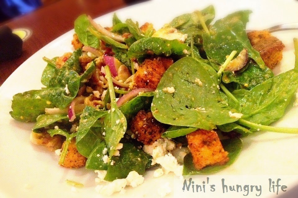 記得很久很久很久以前在一家西班牙餐廳吃到他的菠菜沙拉,大大的嚇了一跳,台灣傳統吃到的菠菜(都叫做白龍仔菜)有一個草的生腥味,可是這種大顆美式(sorry我真的不知道該怎麼稱呼他)的菠菜,葉片大而橢圓,入口是滑嫩即化,沒有多餘的木質部纖維,也沒有白龍仔菜咬不斷的葉脈。是一種沒齒難忘的美好風味。其中微酸的費達起司,正好賦予滑溜菠菜最適合的味覺,麵包丁和培根則是增添它的口感層次。對於排斥蘿蔓類生菜的人,真的是一大福音!!!不知道其他的美式餐廳,有沒有這道菠菜沙拉,有的話,真的是應該要盡快消滅他!!!!!!!!!!